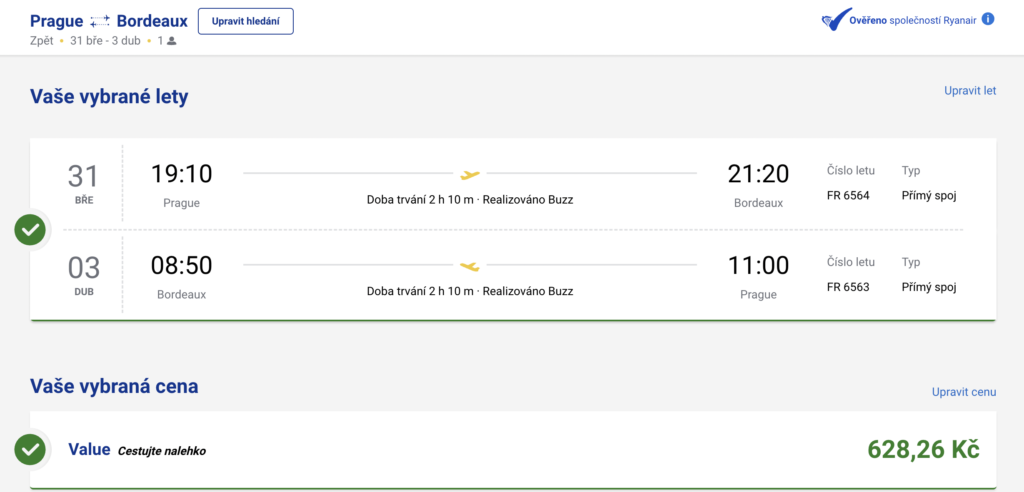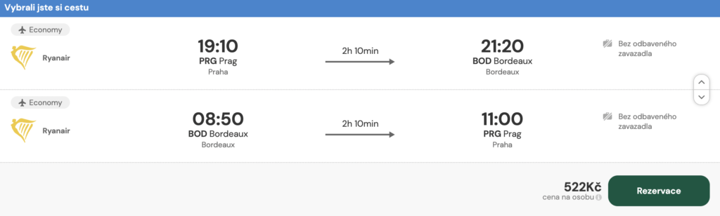 Případně lze letenky zakoupit přímo na webu Ryanair, kde se v současnosti prodávají za 628 Kč.
